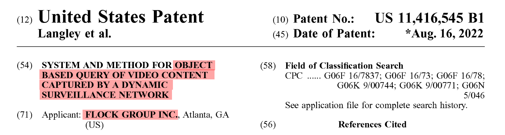 Flock was also granted a patent in 2022, titled "System and Method for Object Based Query of Video Content Captured By A Dynamic Surveillance Network", that described much more alarming capabilities than just license plate look-ups.