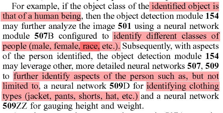 See below, the patent grants the ability to detect human beings, and if it does, it can analyze the images, looking for: